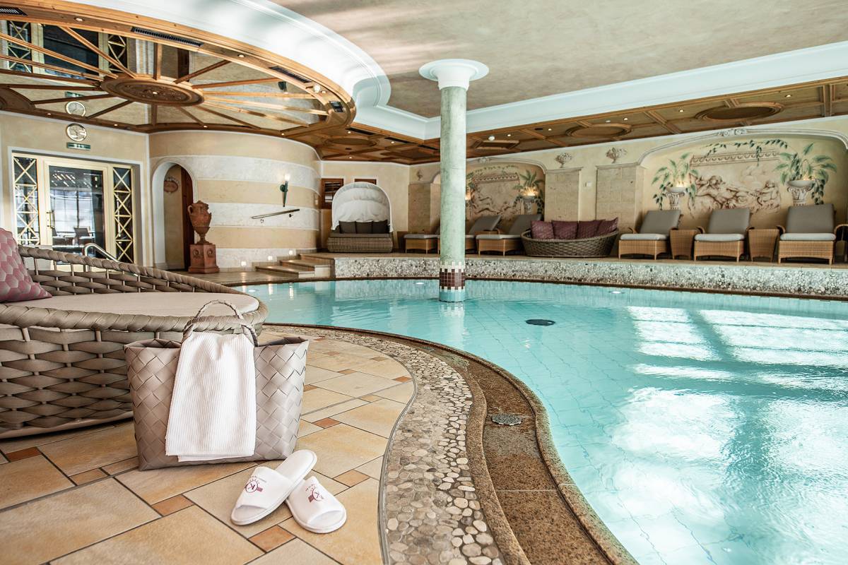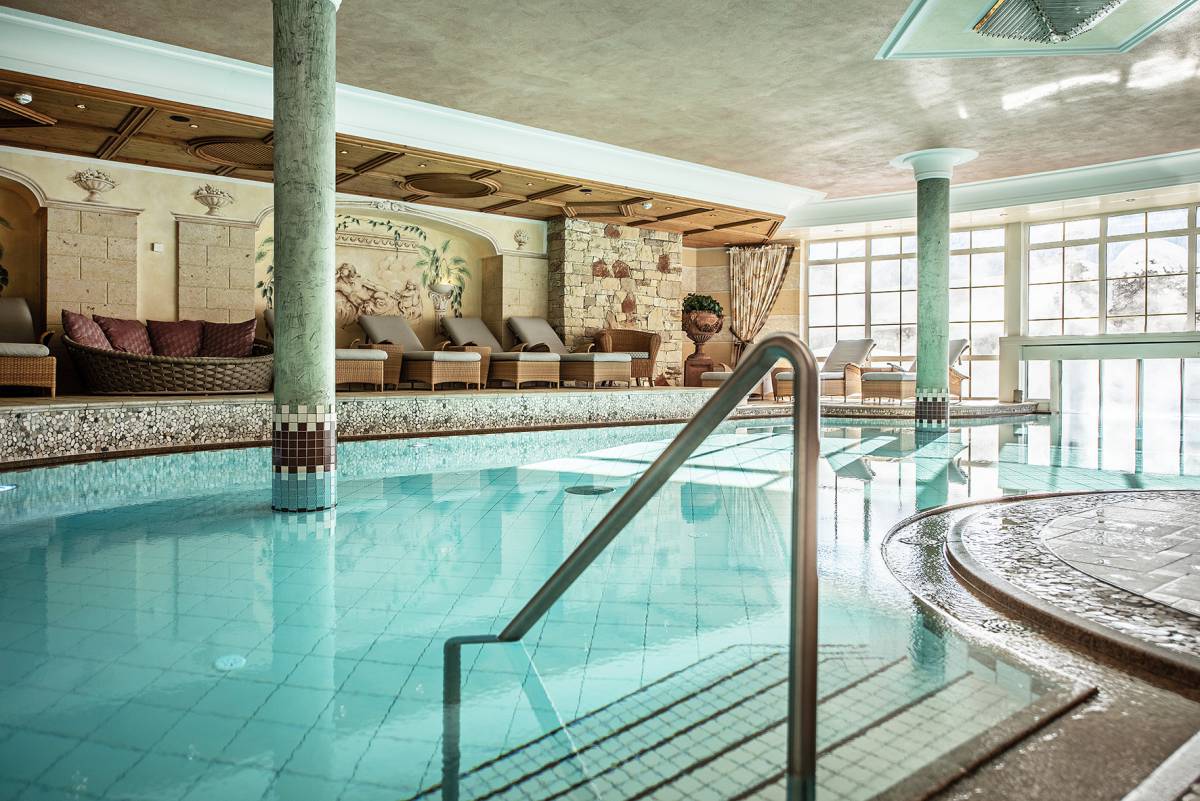 Amphoren, Mamorsäulen und Mosaike: Die Badelandschaft im Hotel Karwendel in Pertisau umschmeichelt Sie mit römischem Ambiente. Geschwungene Formen, angenehmes Licht & Farben, Düfte & Klänge betören sanft die Sinne.
