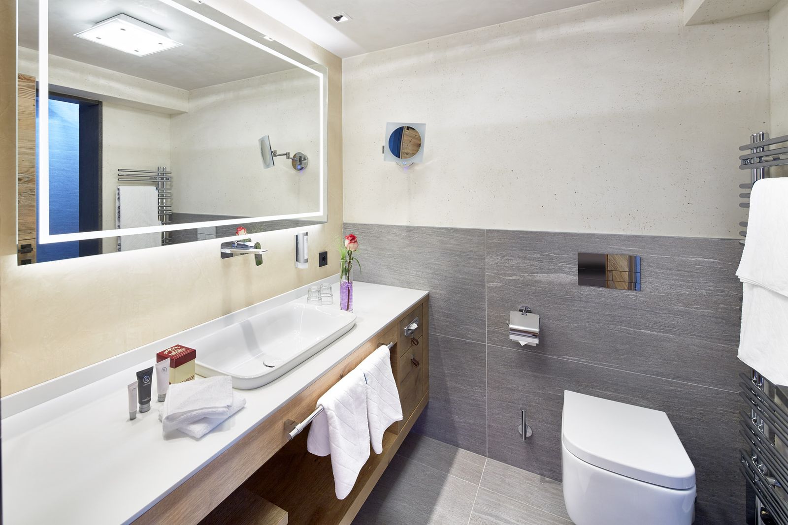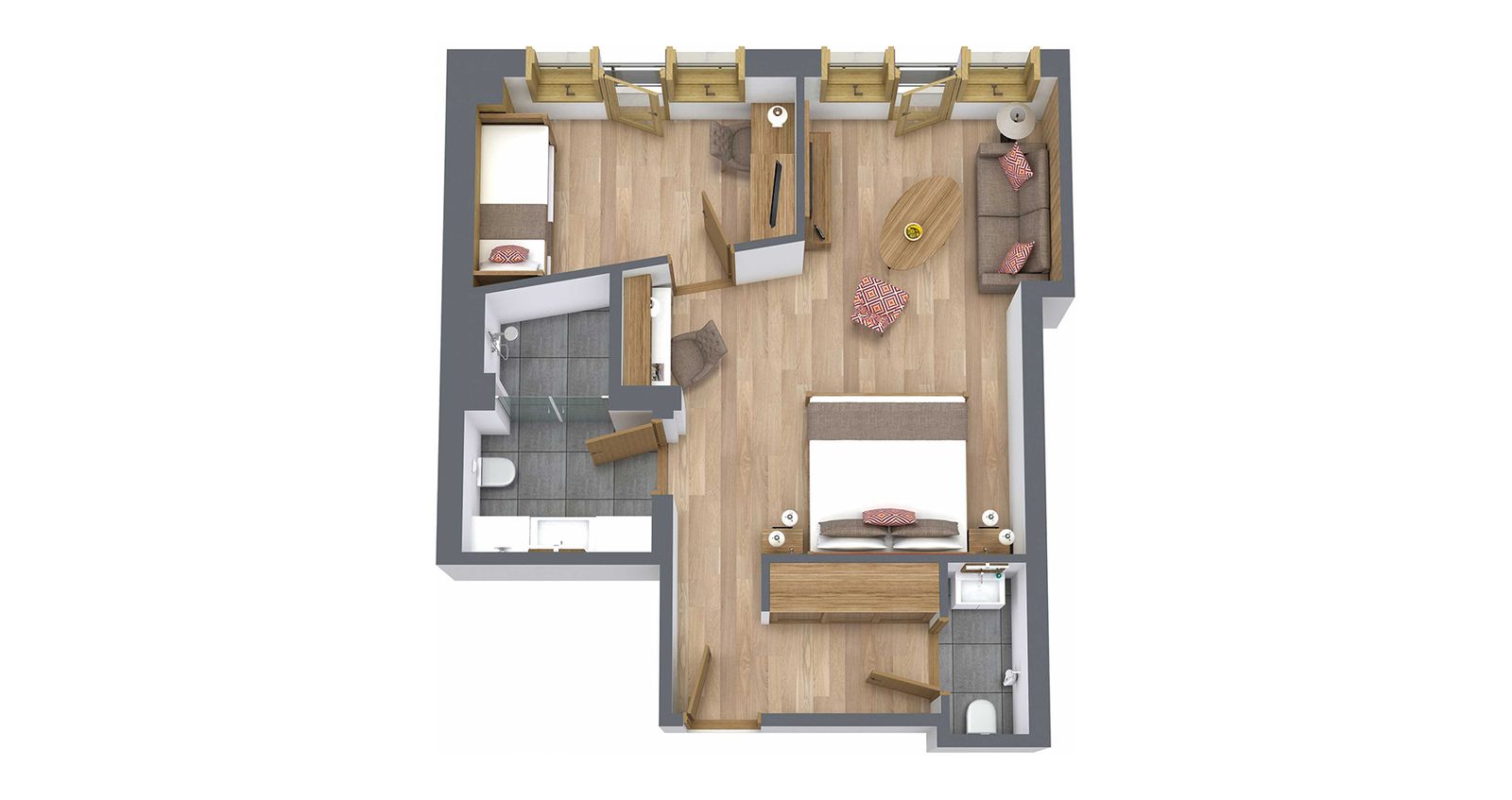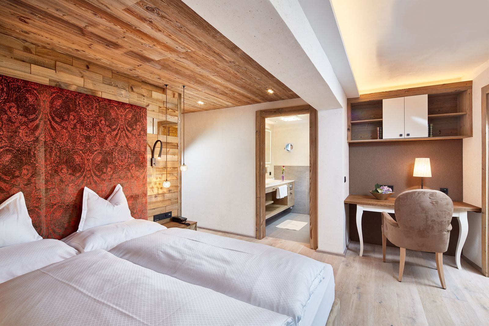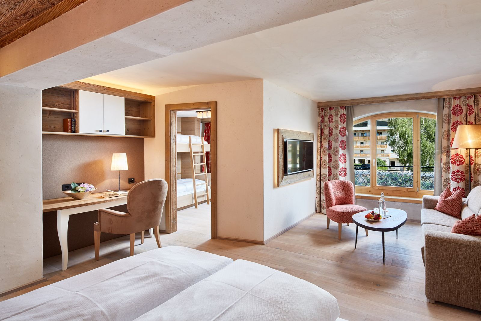 Top-Familiensuite allergikerfreundlich mit exklusivem Holzboden, mit alpinen Elementen ausgestattet, gepolsterter Lodenwand, schönem Wohn-Schlafzimmer mit gemütlicher Sitzecke, separates Kinderschlafzimmer, Badezimmer mit begehbarer Dusche & WC, separates Kinder-WC, Schreibtisch im Eltern- & Kinderzimmer, schwenkbaren Flat-TVs im Eltern- & Kinderzimmer, Espressomaschine, Kühlschrank, W-Lan-Internetanschluss, Safe und französischem Balkon, haustierfrei