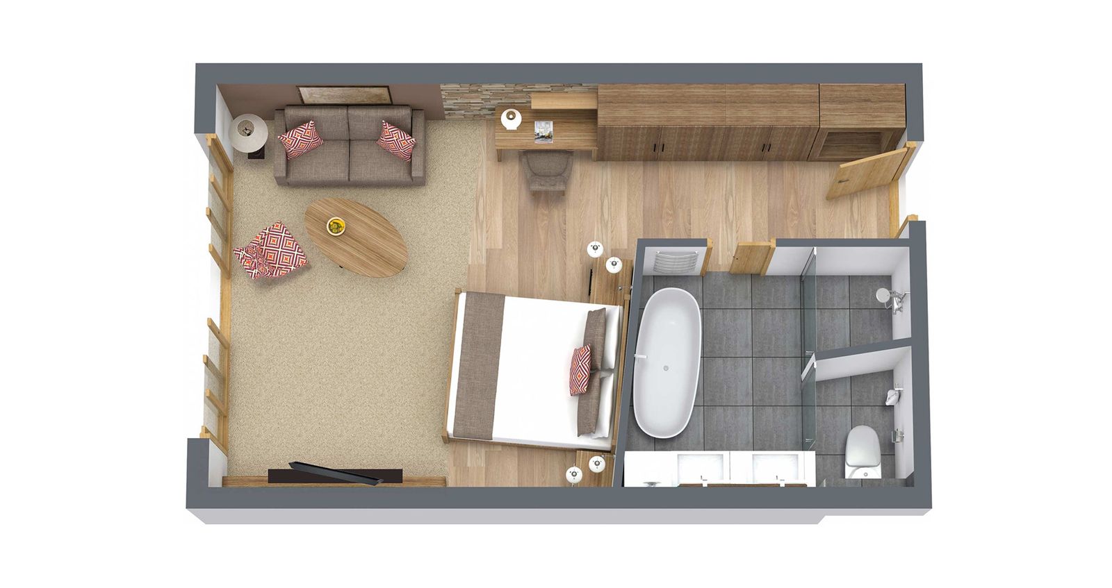 Erstklassige Suite mit alpinen Materialien ausgestattet, Natursteinverkleidung, gepolsterter Lodenwand, Wohnbereich mit gemütlichem Sofa, Kühlschrank,romantischem Effekt durch Kamin-LED-Feuerstelle, schwenkbarem Flat-TV, Luxusbadezimmer mit Doppelwaschbecken, begehbarer Dusche sowie freistehender Badewanne und getrenntem WC,