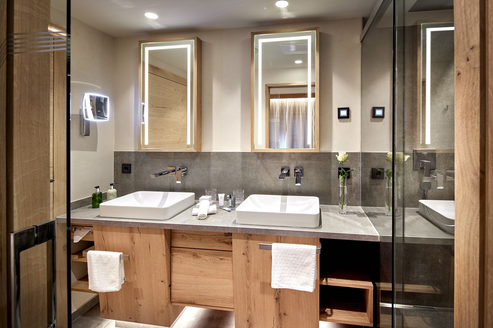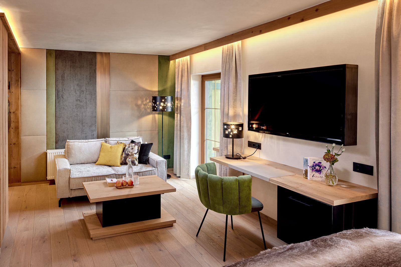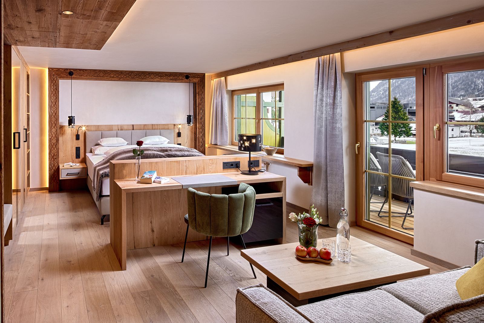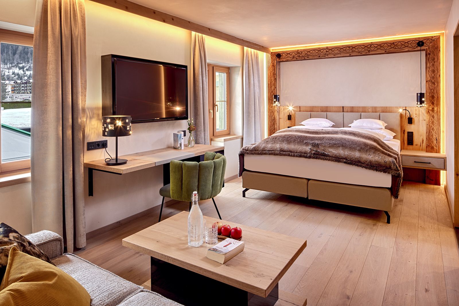 Double room in modern alpine style with exclusive oak wood floor, noble wall design made of metal, cord and leather, comfortable couch, retractable & rotatable flat screen TV, fridge, W-Lan internet connection, safe, modern bathroom with double washbasin, walk-in shower, separate WC, hairdryer, radio, telephone and south-facing balcony - floor plans may vary.