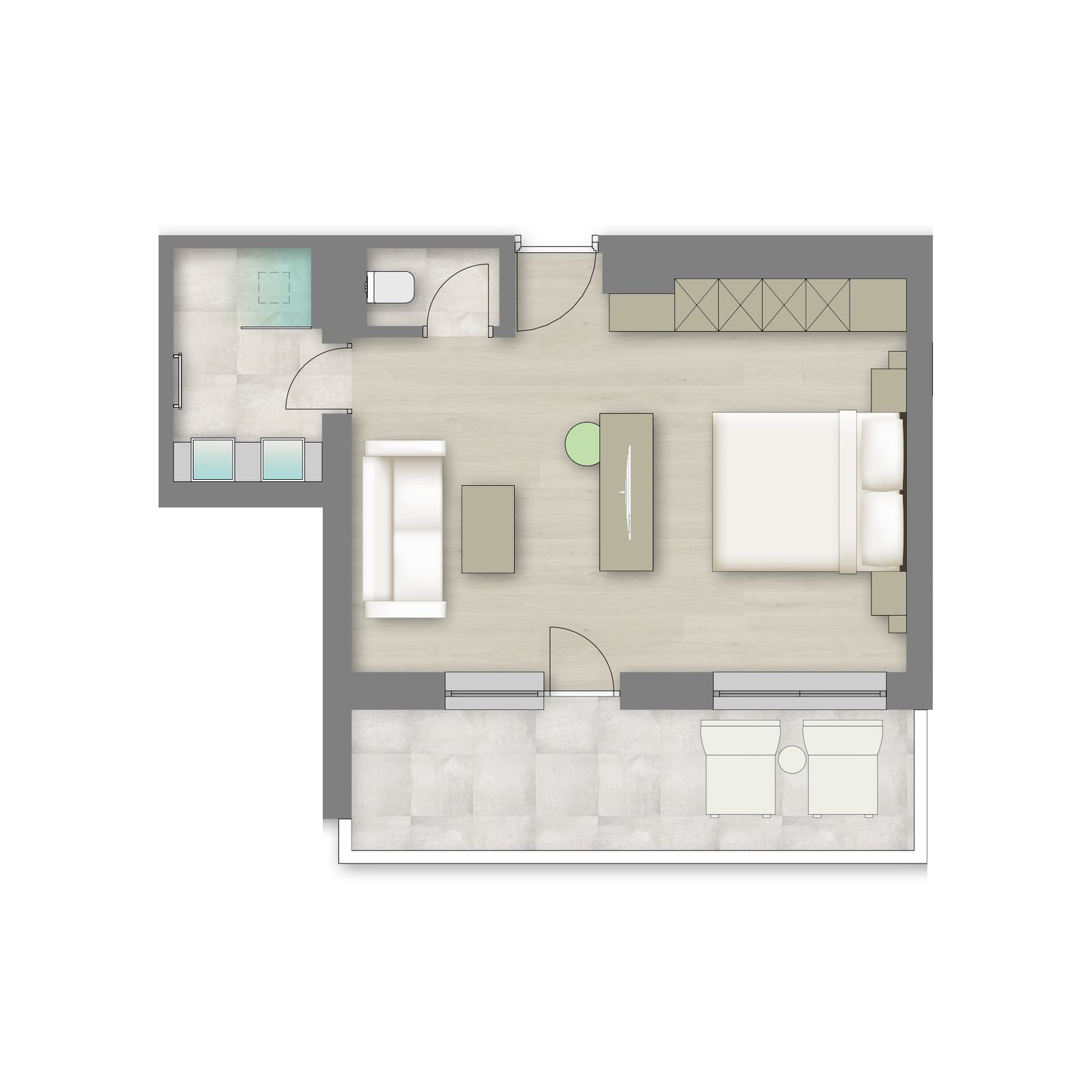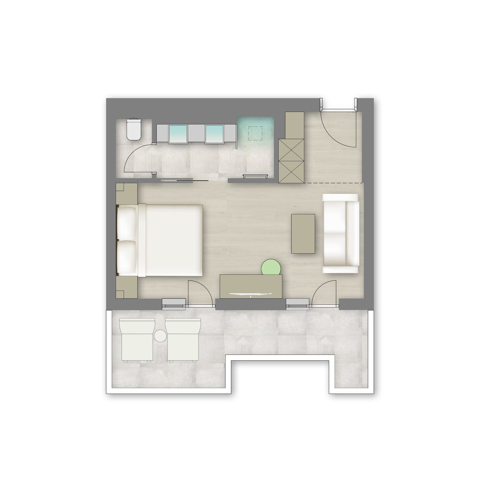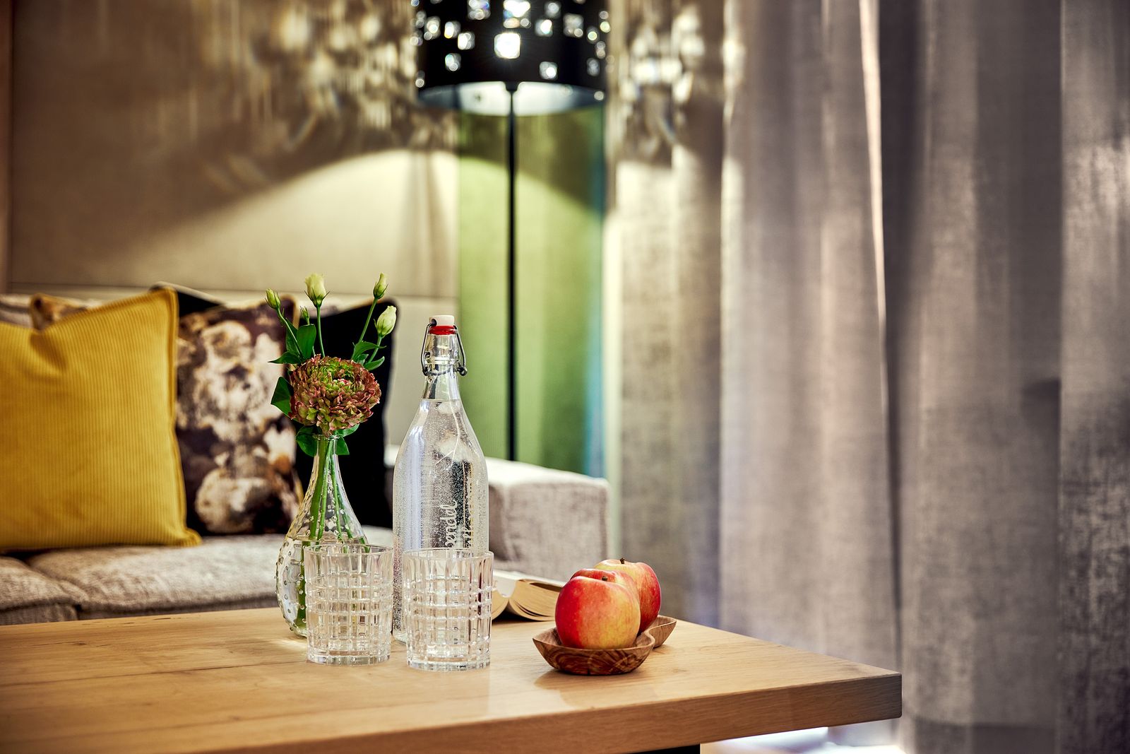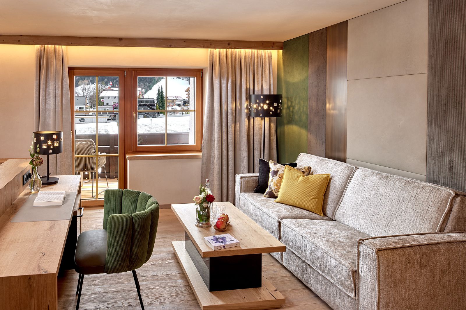 Double room in modern alpine style with exclusive oak wood floor, noble wall design made of metal, cord and leather, comfortable couch, retractable & rotatable flat screen TV, fridge, W-Lan internet connection, safe, modern bathroom with double washbasin, walk-in shower, separate WC, hairdryer, radio, telephone and south-facing balcony - floor plans may vary.